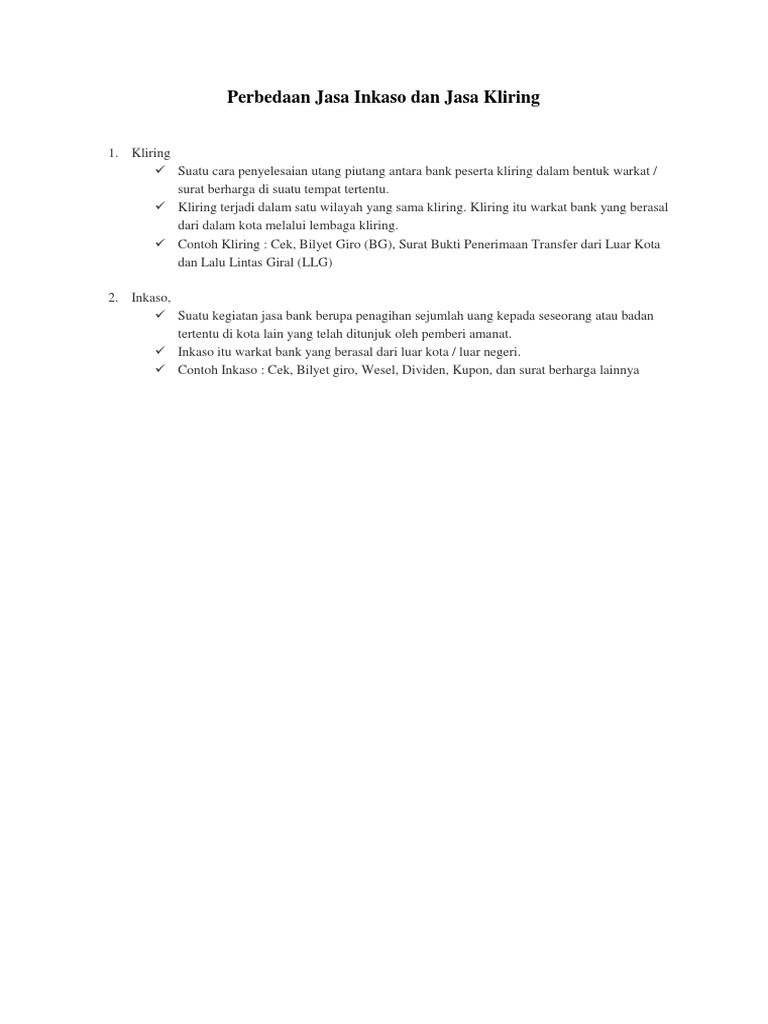 Mari saya akan jelaskan perbedaannya. Produk simpanan berupa tabungan dan deposito berjangka. Semoga bermanfaat untuk menambah wawasan kita. Pengertian inkaso inkaso merupakan kegiatan jasa bank untuk melakukan amanat dari pihak ketiga berupa penagihan sejumlah kepada inkaso keluar yaitu kegiatan inkaso atas instruksi nasabah untuk melakukan penagihan kepada pihak ketiga di cabang bank sendiri atau bank lain di luar kota. Kemudian masukkan kode bank dan diikuti dengan nomor virtual masukkan nominal yang di transfer dan pilih benar.